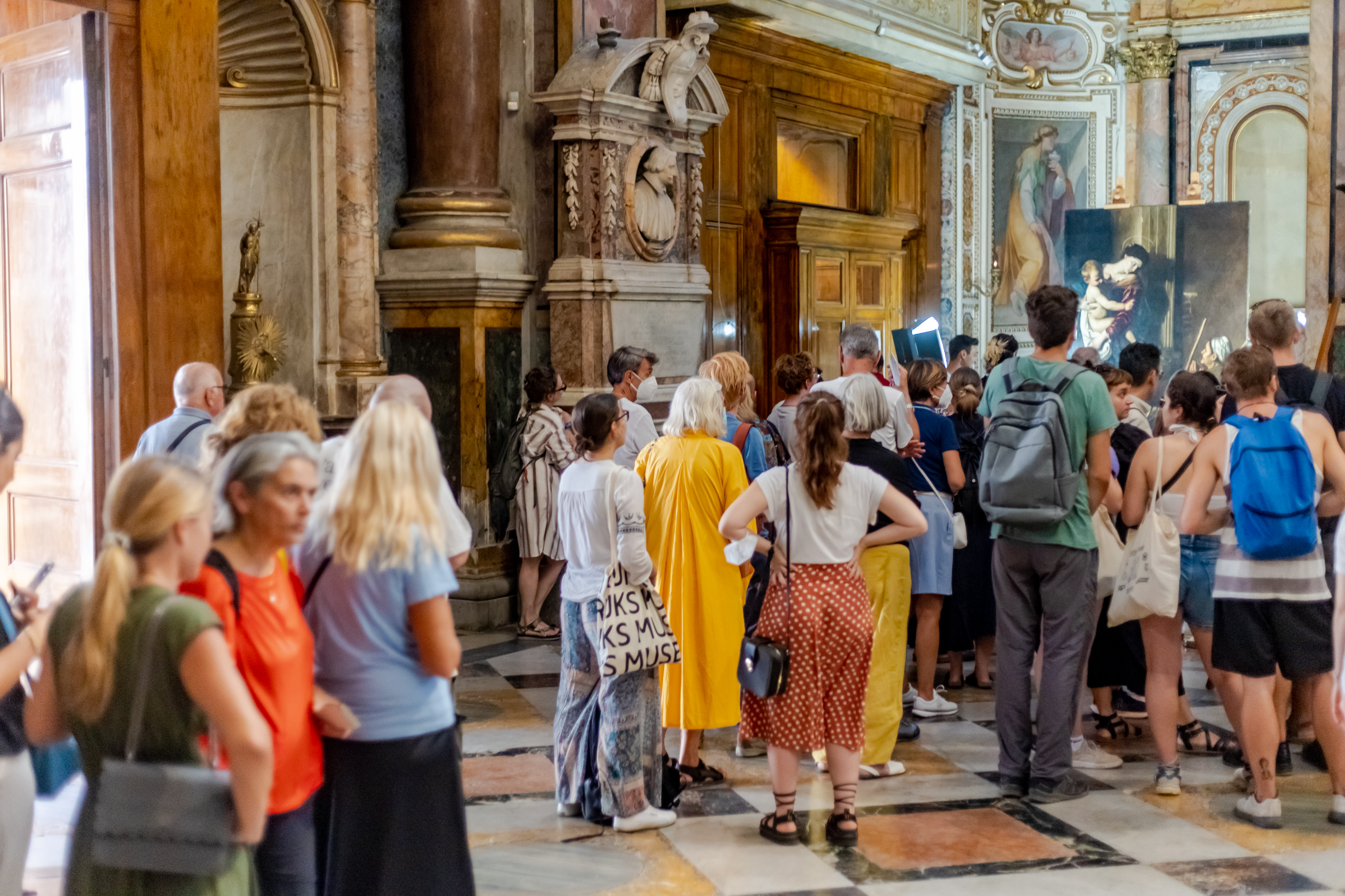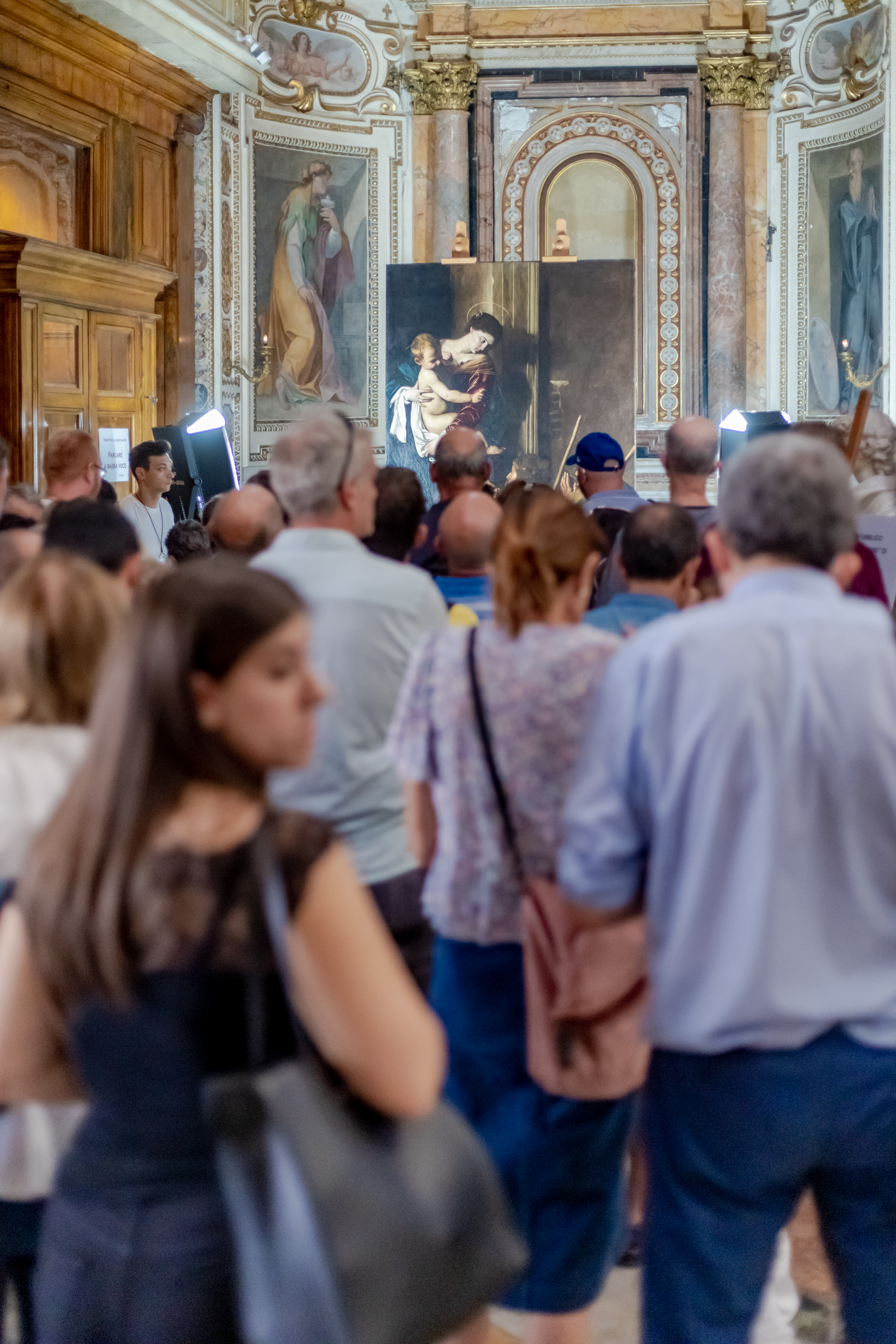 Il dipinto verrà fatto scendere dall’altare per essere posizionato su un cavalletto proprio di fronte alla cappella. Qui sarà allestito uno spazio operativo che consentirà ai restauratori di svolgere operazioni apparentemente semplici ma estremamente delicate come la spolveratura e la verifica della stabilità della pellicola pittorica. Oltre ad una attenta analisi anche del retro della tela e del suo corretto tensionamento, verrà eseguita una dettagliata campagna fotografica, che ci consentirà di avere immagini aggiornate che costituiscono un importante parametro per il futuro. Tutto questo avverrà pubblicamente, sotto gli occhi dei fedeli e dei turisti che si troveranno a varcare in questi giorni la soglia della chiesa. Il team dei restauratori risponderà alle loro domande fornendo tutte le informazioni richieste anche con l’ausilio di supporti visivi.
