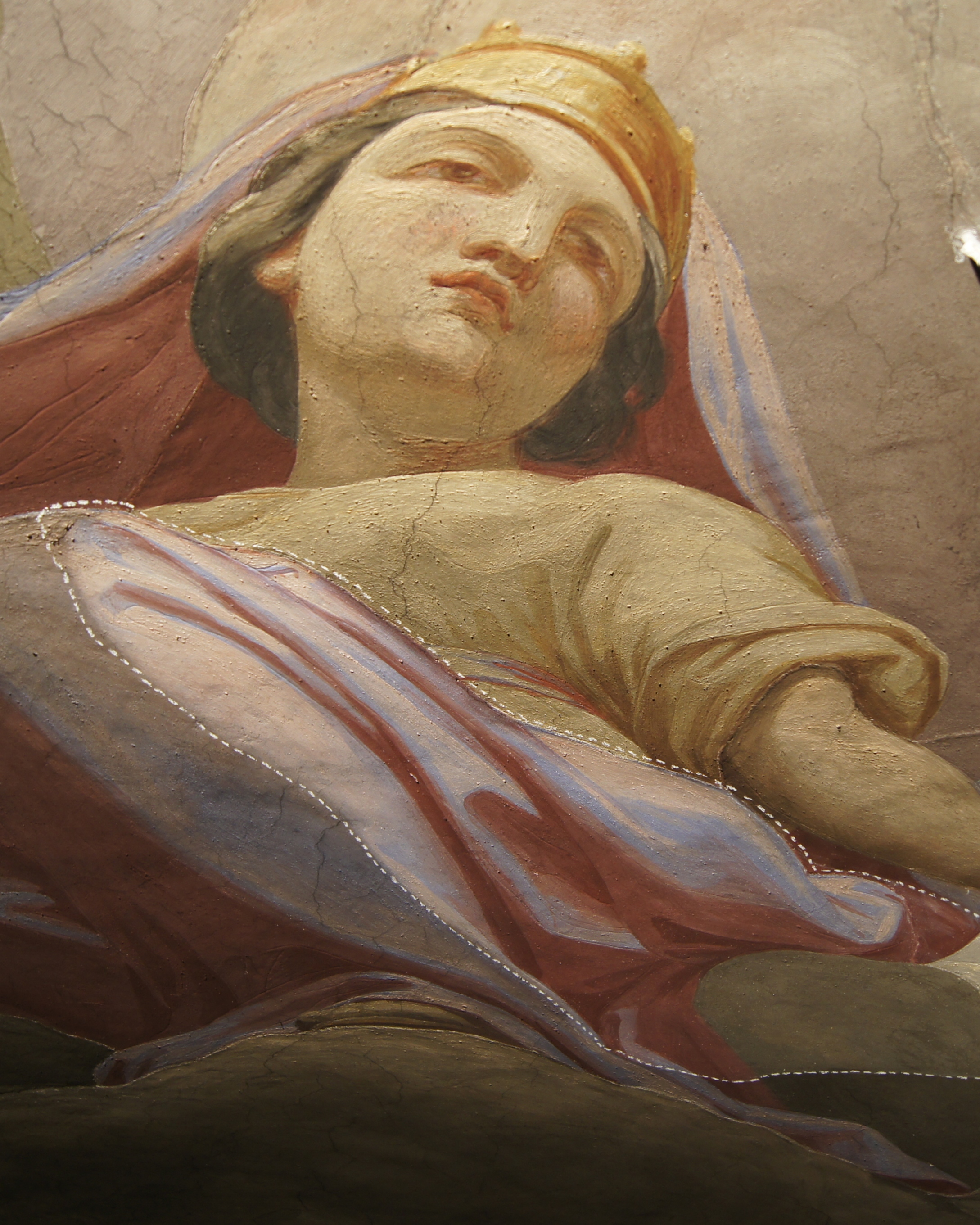 Contemporaneamente al lavoro di consolidamento strutturale, ci siamo occupati dei magnifici affreschi che decorano la chiesa di San Girolamo dei Croati, costruita e in parte decorata tra il 1588 e il 1589, e conclusa nella sua decorazione solo nel corso del XIX secolo. Questi due secoli e mezzo di distanza tra un’intervento pittorico e l’altro ha fatto si che, durante il restauro, abbiamo dovuto occuparci della conservazione di affreschi di due periodi molto diversi, con tecniche e colori diversi. Ciò ha richiesto decisamente una maggiore attenzione da parte delle restauratrici, in quanto era assolutamente fondamentale assicurarsi di trovare una uniformità a coerenza stilistica ed estetica tra le diverse aree ad affresco.