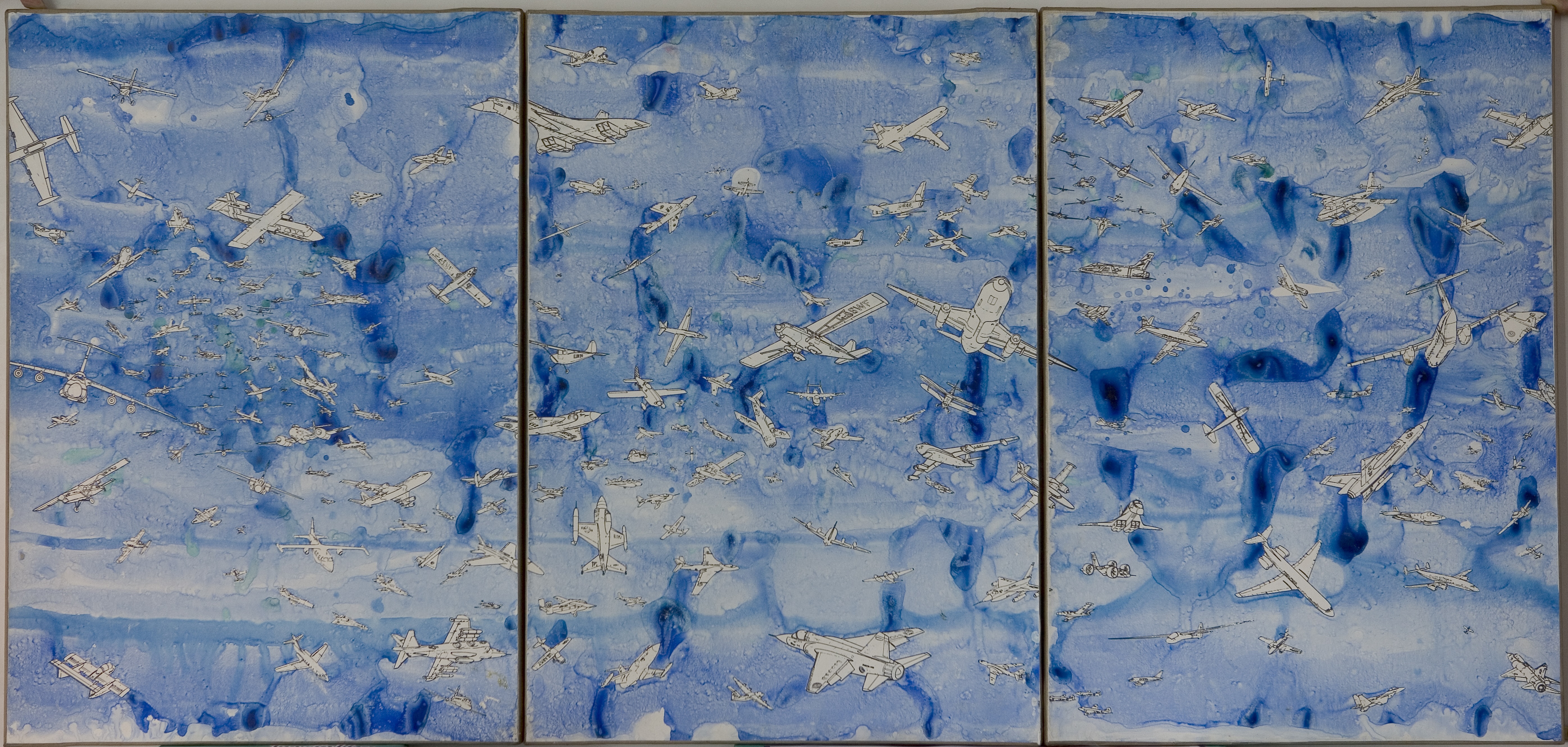 Restauro del dipinto "Aeroplani" di Alighiero Boetti del 1990. China su carta telata.